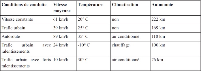Pour ce véhicule, un test a été également réalisé qui montre bien à quel point les conditions extérieures peuvent faire varier considérablement l’autonomie d’une voiture électrique. Avec une même quantité d’énergie il est possible de réaliser entre 222 et 76 km en fonction du type de circulation rencontrée, de la vitesse et des conséquences des conditions climatiques (influençant à la fois le fonctionnement de la batterie et surtout pénalisant l’autonomie dans le cas d’une utilisation intensive de la climatisation), comme le montre le tableau ci-dessous.