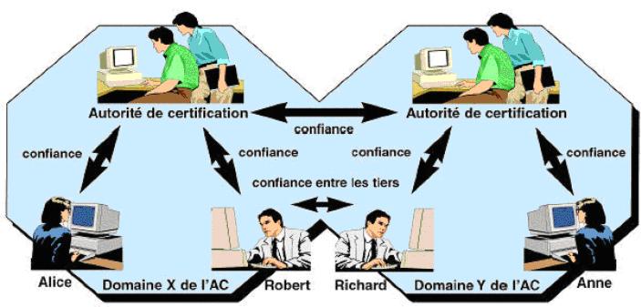 La confiance entre les tiers est une exigence fondamentale de toute implantation à grande échelle de services de sécurité reposant sur la cryptographie à clef publique. En effet, celle-ci nécessite l’accès à la clef publique d’un utilisateur. Toutefois, dans un réseau de grande taille, il est impossible et irréaliste de s’attendre à ce que chaque utilisateur établisse au préalable des relations avec tous les autres utilisateurs. En outre, comme la clef publique d’un utilisateur doit être accessible à l’ensemble des autres utilisateurs, le lien entre une clef publique et une personne donnée doit être garanti par une tierce partie de confiance, afin que nul ne puisse se faire passer pour un utilisateur légitime. Une tierce partie de confiance, dont les mécanismes sont sûrs, permet aux utilisateurs d’avoir implicitement confiance dans toute clef publique certifiée par cette tierce partie.