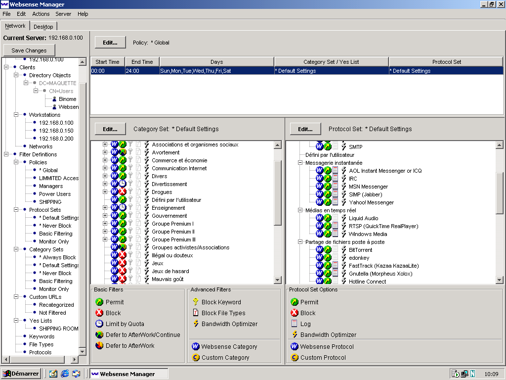 Filtrage par tranche horaire – Fonctionnalité permettant d’activer un filtrage pendant certaines heures de la journée, certains jours de la semaine. Ceci permet de bloquer les accès pendant les heures de bureau ou pendant les heures de saturation du réseau.