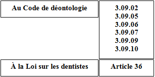 Ci-contre apparaissent les infractions déontologiques les plus souvent reprochées125 les unes en regard du Code de déontologie, les autres en rapport avec la Loi sur les dentistes126