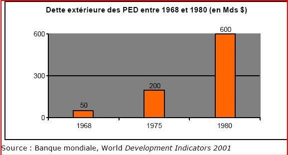 Comment la dette extérieure des Pays en développement PED a-t-elle évolué depuis trente ans ? Rappelons d’abord que la dette a été multipliée par 12 entre 1968 et 1980.