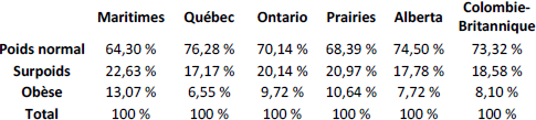 | Poids normal | Maritimes12,64 % | Québec11,64 % | Ontario17,69 % | Prairies13,89 % | Alberta Colo Brita6,37 % 8,0 | mbie- Total nnique 5 % 70,28 % |