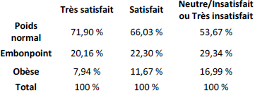 Selon nos résultats, les gens ayant répondu qu’ils étaient neutre/insatisfaits/très insatisfaits de leur vie étaient plus susceptibles d’être obèses que ceux qui étaient très satisfaits ou satisfaits de leur vie en général. Cette relation était significative au seuil de 1 %.