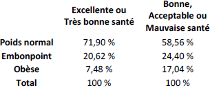Ici nous constatons que les gens qui ont un sentiment d’appartenance très fort, faible ou très faible face à la communauté ont des taux d’obésité et d’embonpoint supérieur par rapport à ceux qui ont un fort sentiment. Cette relation était significative à 1 %.