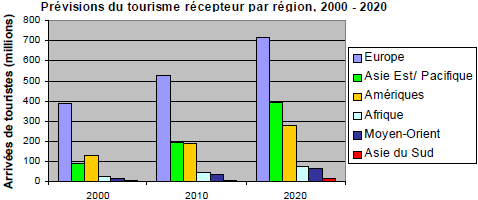 Le continent le moins performant sera l’Europe, en terme de taux de croissance. Le nombre d’arrivées de touristes internationaux passera de 386 à 526 millions pour la période 2000-2010, pour atteindre 717 millions en 2020. Ce dernier chiffre représente, quand même, le double des arrivées.