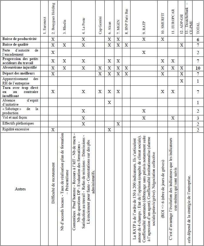 Toutes les entreprises font appel à des indicateurs au niveau de management et des Instances Représentatives du Personnel. Il nous semble nécessaire de compléter la position d’EURONEXT et de BOUYGUES Holding.