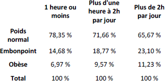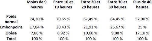 Ici nous voyons que plus le nombre d’heures de sédentarité est élevé et plus le taux d’individu ayant un poids normal diminue en conséquence. Par exemple, les individus passant moins de 9 heures par semaine à pratiquer une activité sédentaire avaient un poids normal dans une proportion de 74,3 %. Ce ratio passait à 57,9 % chez les individus qui passaient plus de 40 heures par semaine à pratiquer une activité sédentaire.