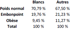Le tableau 2.3 indique une relation entre le poids et l’origine ethnique.