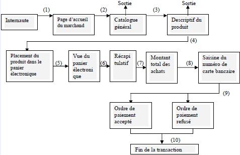 L’internaute visite le site du fournisseur (1) et consulte son catalogue de produits et/ou de services (2). Il choisit le(s) produit(s) qui l’intéresse(nt) et consulte leur descriptif (3). S’il décide de l’acheter, il le place dans le panier virtuel (4). Il peut vérifier les produits que son panier virtuel contient (5,6) ainsi que le montant total des achats (7). Ensuite, il choisira le mode de paiement. Qu’il paie par carte bancaire ou par un autre instrument de paiement (par exemple par un porte-monnaie électronique), il devra saisir les données nécessaires (8). L’établissement émetteur vérifiera les données et acceptera ou refusera l’ordre de paiement (9). Il communiquera sa décision au fournisseur (10), lequel, en cas d’acceptation de l’ordre de paiement, accusera réception de la commande.