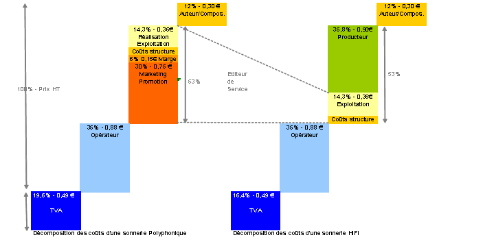 Décomposition des coûts d’une sonnerie polyphonique et d’une sonnerie HiFi.