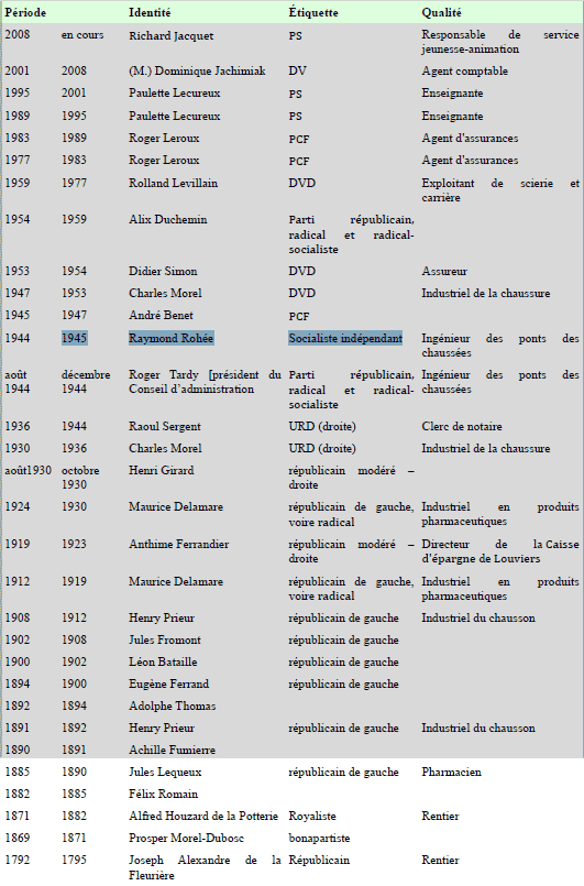 En effet, depuis 1792 la ville a connu 31 Maires sous différentes couleurs politiques (voir tableau suivant).