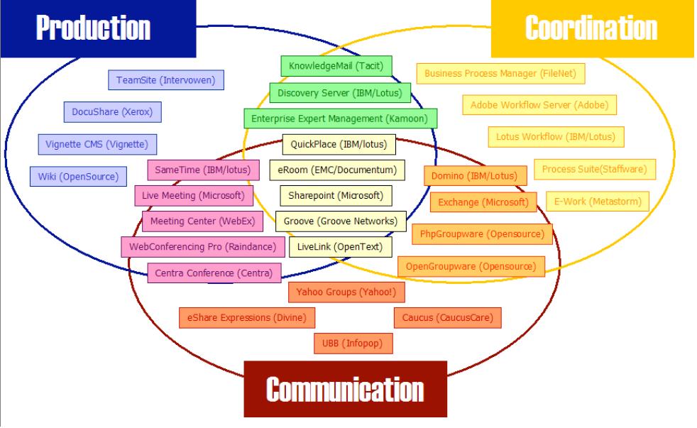 Gilles BALMISSE, dans un livre blanc consacré aux nouveaux outils du travail collaboratif42 offre une typologie intéressante des outils du marché actuel en les répartissant en trois grandes parties : production, coordination et communication43.