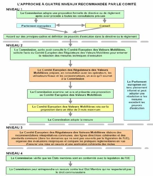 Il s’agit d’une méthode pragmatique, prenant en compte le désir selon lequel la directive doit rester générale et le règlement entrer dans le détail. Plus précisément il s’agit d’une approche réglementaire à quatre niveaux, dont l’efficacité semble avérée. Les institutions européennes se félicitent dans divers rapports de l’effet positif de ce processus et réfléchissent déjà à le renouveler et à l’élargir à d’autres domaines18.