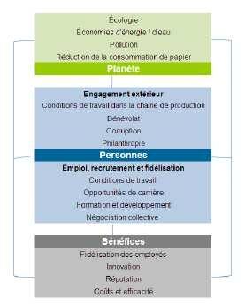 En 2009, le cabinet de conseil Krauthammer publiait une étude45 sur le sujet en définissant 16 domaines dans lesquels s’applique la RSE (voir ci-contre). Parmi les conclusions de ce rapport, on retiendra les suivantes :
