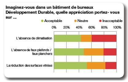 Le débat autour de ce thème illustre bien les enjeux du développement durable avec ces contradictions. La climatisation est jugée responsable des émissions de GES en raison des dispositifs nécessaires à son fonctionnement, et source d’infections et de gênes pathogènes en cas de mauvais entretien, et source d’inconfort quand les caractéristiques et le réglage ne sont pas optimums. Pour autant, les utilisateurs ne sont pas prêts à y renoncer pour le moment, comme semble l’indiquer l’enquête ARD/DTZ sur l’immobilier tertiaire en IDF (2009)49.