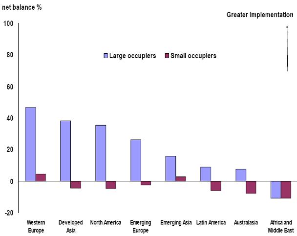 Une récente étude internationale publiée par la RICS43 vient confirmer cette tendance. A la question « Comment l’implémentation de solutions durables en immobilier a-t-elle évolué ces 3 derniers mois, comparés aux 3 mois précédents ? », les réponses montraient des écarts très importants entre les petits occupants ( 49 employés). Notons également dans cet exercice de comparaison que la progression la plus importante est en Europe de l’Ouest.