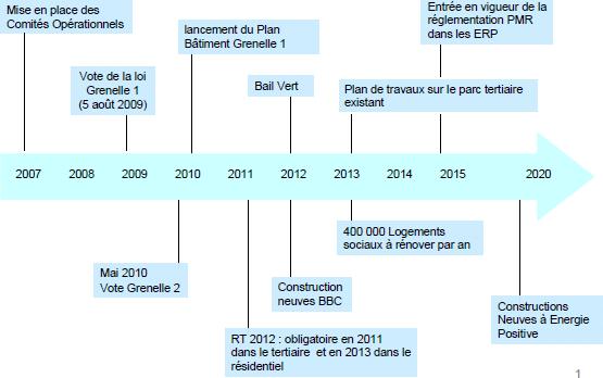 Grenelle 1 est la traduction des engagements pris par l’Etat en 2007. Cette loi de programmation définit un calendrier et des objectifs de réduction des consommations d’énergie des bâtiments neufs et existants: