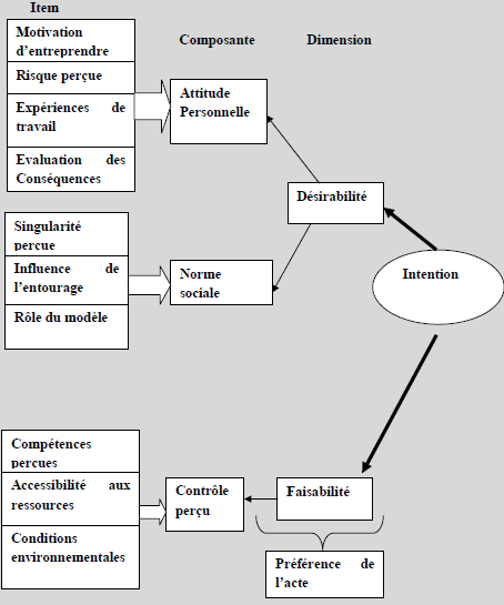 L’intention pour réaliser un comportement dépend en partie de l’influence du regard des personnes proches à l’égard de ce comportement. La norme sociale se réfère aux croyances de l’individu concernant l’opinion de ces personnes de référence par rapport au fait qu’il réalise ce comportement en question. C’est la perception de la pression sociale quant à la réalisation ou non du comportement. Elle se construit en conséquence de l’appréciation faite par l’individu concernant les normes de ses proches et/ou sa motivation à se conformer à ces normes (Krueger et al., 2000). La norme subjective génère des croyances normatives de l’individu. L’influence sociale est fonction des « croyances nor matives ». Ces dernières sont relatives à la perception des autres sur ce que nous devrions faire. Kolvereid (1996) a trouvé un effet significatif direct des normes sociales sur l’intention. Toutefois, dans l’étude de Fayolle et Gailly (2004), la relation entre l’intention et les normes sociales ne sont pas significatives. Selon Shapero et sokol, plus un système social accorde de la valeur à l’innovation, à la prise de risque, à l’autonomie, plus fortes seront les perceptions de désirabilité, et plus l’on verra des entreprises se créer. Ainsi, nous remarquons que :