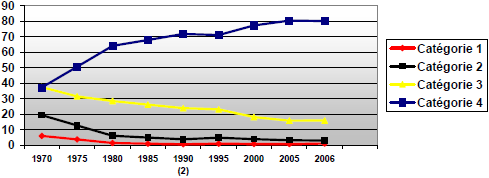 Nous pouvons remarquer que depuis les années septante, la proportion du personnel effectuant des tâches complexes s’est accrue au fil des années pour plus que doubler en 35 ans. En 2006, les tâches exigeant un niveau de qualification élevé mobilisent les 4/5 de l’ensemble des ressources humaines dans ce secteur d’activité. Parallèlement, le personnel exécutant des tâches n’apportant que peu de valeur ajoutée, a vu sa proportion fortement diminuer sur cette même période.