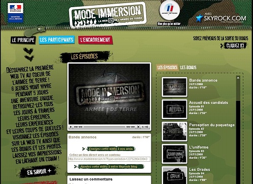 Un exemple avec l’Armée de Terre qui lance Mode Immersion, sa Web TV, diffusant un programme de invitant les internautes à découvrir chaque jour pendant une semaine les vidéos de six jeunes en immersion totale au sein des équipes de l’Armée.