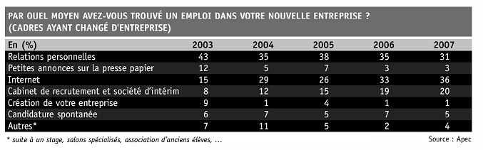 Et bien que la situation évolue d’année en année grâce à la vulgarisation de l’Internet, on remarque que relativement peu de cadres déposent leur résumé dans les CVtèques et que les services tels que les Newsletter* et Agents d’emploi* ne sont pas appréciés à leur juste valeur.