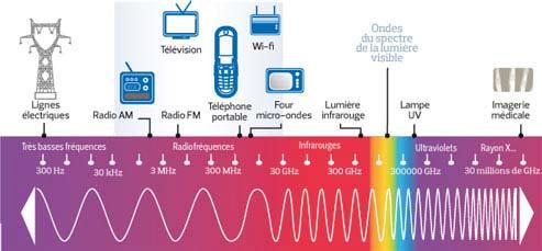 Les champs électromagnétiques sont classés dans le spectre électromagnétique selon leur fréquence et leur longueur d’onde25. Le spectre s’étend des Extrêmement basses fréquences, générées par exemple par les lignes électriques, jusqu’aux Enormément hautes fréquences que sont les rayons cosmiques. Les champs électromagnétiques ayant la fréquence la plus élevée (comme les rayons X ou les rayons gamma émis par les matières radioactives) sont appelés « rayonnements ionisants », ce qui signifie qu’ils ont la propriété de pouvoir rompre les liaisons qui relient les molécules entre elles dans les cellules. En revanche, les autres champs électromagnétiques, en l’occurrence ceux auxquels nous nous intéressons, n’ont pas cette propriété, ils sont dits « non ionisants ».