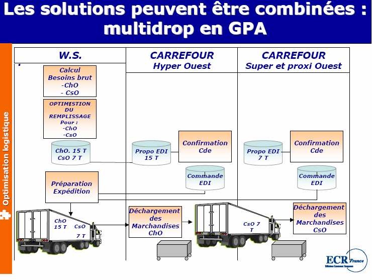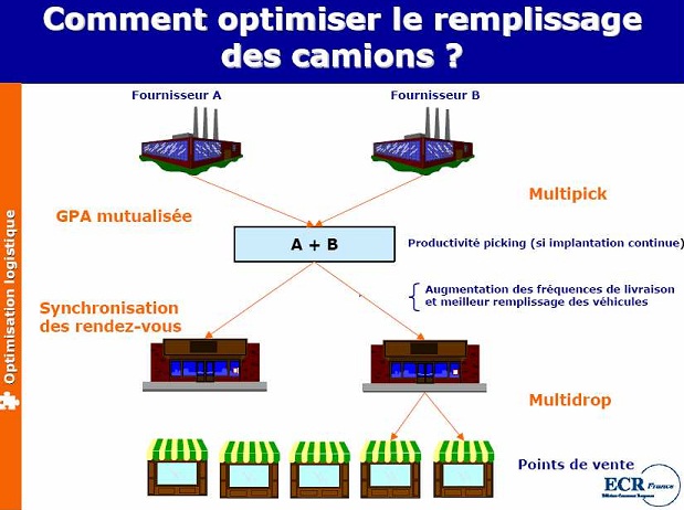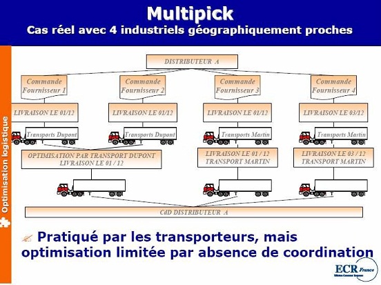 Pour pouvoir optimiser leur chaîne logistique et augmenter la qualité de collaboration, le distributeur Carrefour, l’industriel « Panzani » et le prestataire logistique « Hays logistique » n’ont pas hésité à réaliser une étude en collaboration avec l’association ECR sur l’optimisation logistique multifournisseurs, multiclients, l’intégration des prestataires et sur la pratique du Multipick, multidrop dans le cadre la GPA mutualisée.