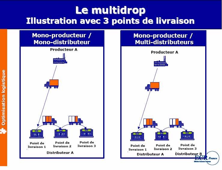 Dans ce cas la situation est inverse que la situation précédente, la mutualisation des transports se fait sur les points de livraison auprès des distributeurs. On nommera cette opération « Multidrop » (cf. figure 9).
