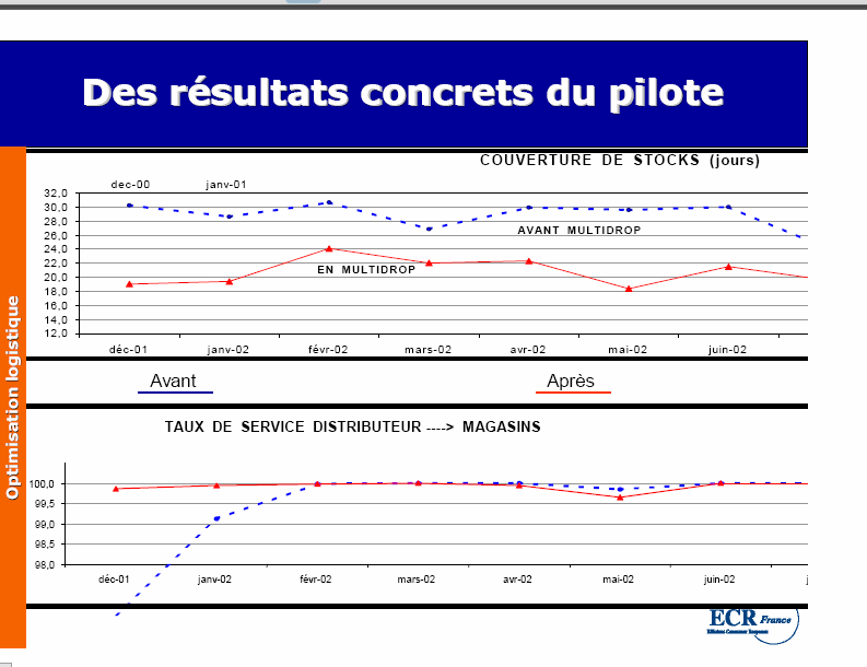 Grâce à ces opérations de mutualisation, en plus de l’augmentation des taux de remplissage des camions, les acteurs de cette étude ont pu constater une nette réduction de leur jour de couverture de stock de décembre 2000 à juin 2002. Mais également une augmentation de du taux de service en magasins de décembre 2001 à juin 2002.