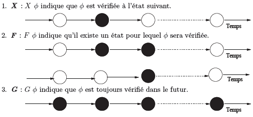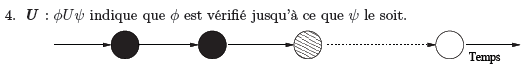 Nous explicitons la sémantique des opérateurs temporels X , F , G et U avec les figures suivantes (les états en noir indiquent que la formule est vérifiée) :