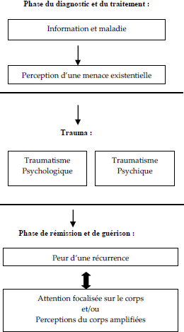 Parmi les diverses expressions cliniques du traumatisme qui ont pour origine le cancer, les principales sont la peur de la récidive, une attention focalisée sur le corps ou des perceptions corporelles amplifiées (DELVAUX, TSIAMITA et FAVARCQUES, 2001).