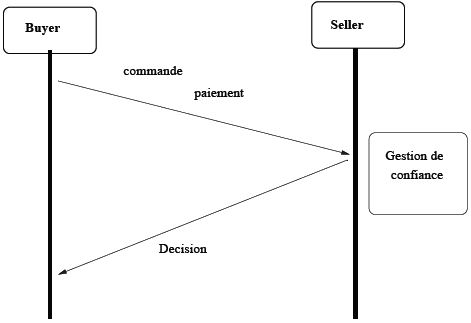 Dans cette figure, le client envoie sa commande au marchand et le paie en utilisant une des méthodes proposées par le marchand. Après avoir eu toutes ces informations, le marchand prend une décision pour traiter la demande du client. Cette décision est prise par le module de Gestion de la confiance.