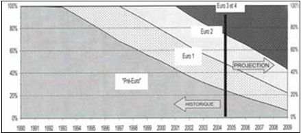 À l’horizon 2010, 10 % du parc automobile français devrait dater des années 1993-1996 (Euro 1), 17 % des années 1997-2000 (Euro 2), 35 % des années 2001-2005 (Euro 3) et 38 % des années 2006-2010 (Euro 4).