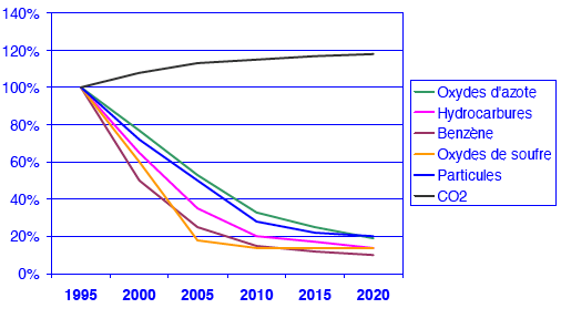 Lorsque l’ensemble du parc automobile sera conforme aux normes Euro 4, c’est-à-dire commercialisés après janvier 2006, les réductions d’émission de polluants seront de l’ordre de 70% pour les Nox, de 86 % pour les COV, de 82% pour les CO et de 79 % pour les particules.