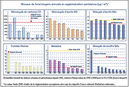 Ainsi, à Paris, sur les dix dernières années, les analyses ont permis d’observer une amélioration globale de la situation notamment en ce qui concerne le CO, le benzène, le dioxyde de soufre, le dioxyde d’azote et les oxydes d’azote (voir graphique ci-dessous).