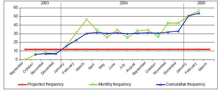 Dès lors qu’elles présentent le « risque » d’être enceinte, les femmes cherchent à se prémunir contre les coûts d’une grossesse grâce au système d’assurance proposé. Le tableau suivant montre comment la fréquence des consultations prénatale est supérieure à celle projetée.