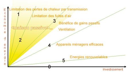 Les frais d’énergie sont linéairement liés aux besoins. Par contre, les coûts d’investissements varieront eux exponentiellement. En effet, les premiers investissements réalisés seront ceux qui permettront de faire baisser le besoin en énergie de l’habitat le plus facilement, tandis que plus il sera isolé, plus il sera difficile de lui faire économiser d’avantage d’énergie.