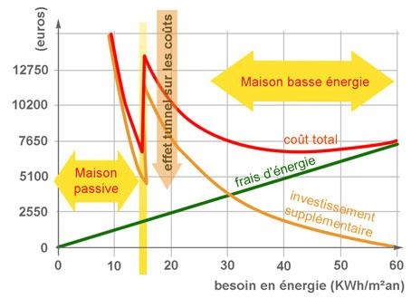 Il arrive cependant un moment où l’investissement supplémentaire permet d’atteindre un niveau de performances tel que le système de chauffage classique dans son ensemble devient superflu. Chaudière, conduites de distribution, radiateurs, vannes, …deviennent inutiles et un simple chauffage d’appoint suffit. Le passage de ce cap permet dès lors de réaliser une exceptionnelle économie, qui provoque une chute brutale du coût de l’investissement supplémentaire et donc du coût total. C’est l’effet tunnel.