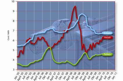 En vert, le prix des pellets (en Cent/kWh) En rouge, le prix du mazout (en Cent/kWh) En bleu, le prix du gaz naturel (en Cent/kWh) Source : Pelletsmagazine58
