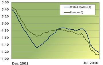 Figure 4: Evolution du prix du Watt crête de 2001 à 2010 en Europe et aux Etats-Unis