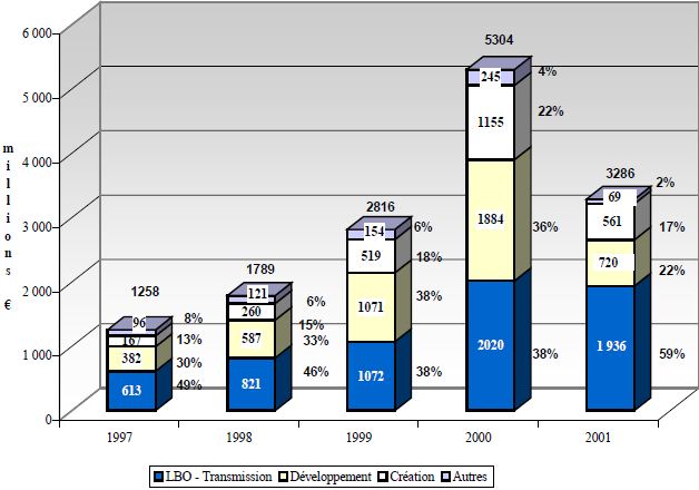 Les levées de fonds en France ont représenté, en 2001, un montant supérieur à 5 milliards d’euros pour 3 300 millions d’euros25 d’investissements. Entre 1993 et 2001, les levées de capitaux ont été ainsi multipliées par huit tandis que les investissements n’étaient multipliés que par deux et demi. Cette tendance s’inscrit dans un contexte d’internationalisation des opérateurs (fonds pan-européens ou transnationaux).