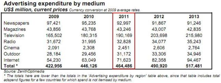 Pour ce travail de recherche, les petites et moyennes agences de communication (jusqu’à soixante salariés) ont été choisies car se sont elles qui risquent le plus de subir la concurrence de cette publicité dite « accessible aux entreprises » au travers des réseaux sociaux. En effet, les grands groupes de communication tels que Publicis n’ont rien à craindre de la création de publicités sur les réseaux sociaux par les entreprises elles-mêmes, car cette publicité n’est qu’une infime partie des campagnes que mènent les annonceurs ayant de gros budgets de communication. Comme le montre le tableau ci-dessous en 2011, les encarts publicitaires et les spots télévisés conservent la plus grande partie des investissements publicitaires dans le monde. Cependant, les prévisions ZenithOptimedia (réalisateur de l’étude) montrent qu’en 2013 le budget publicitaire sur Internet (et sûrement les budgets investis sur les réseaux sociaux donc) dépassera celui des journaux.15