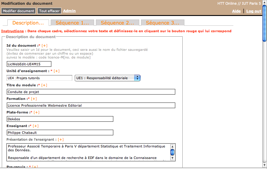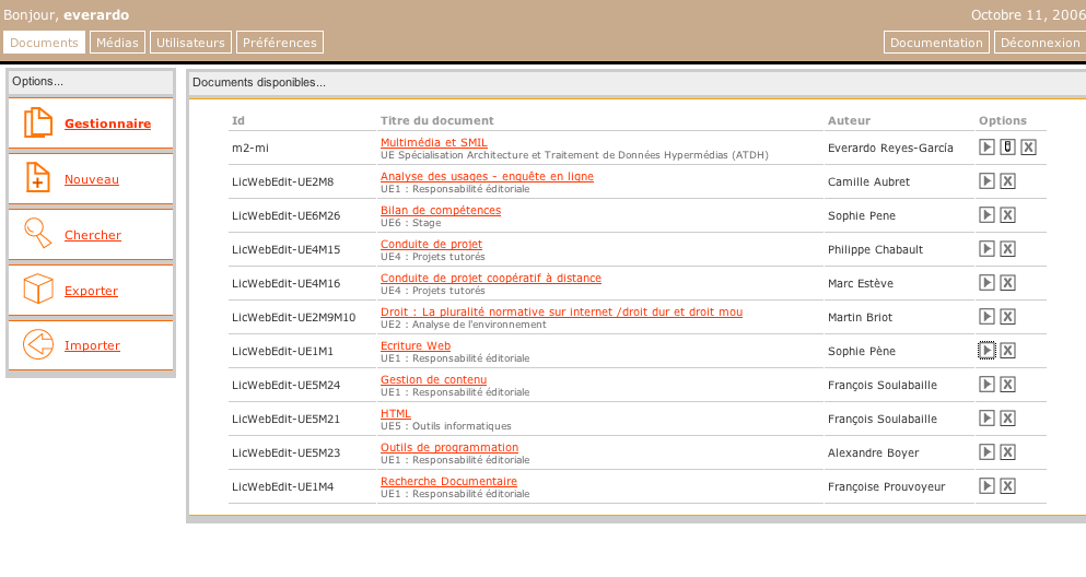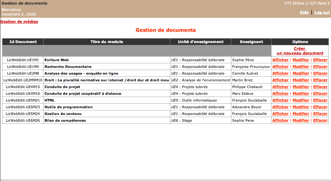 Par exemple, la figure 31 montre l’interface de gestion de documents et l’interface de création de documents de la première version installée à l’Université Paris V. La figure 32 montre les mêmes interfaces correspondant à la version la plus récente, réalisée pour l’Université Paris VIII.