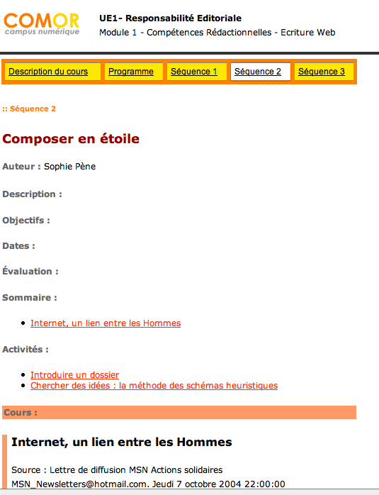 Dans la pratique, nous avons implémenté ce modèle de document au sein du campus numérique COMOR de l’Université Paris V. La version de SPECS installée acceptait une séparation de toutes les composantes d’un DPN et définissait comme règle un maximum de trois séquences pour chaque document.