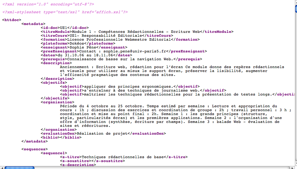 Mais nous ajouterons que la prédéfinition des éléments d’un document pédagogique numérique a d’autres implications tout aussi essentielles. Premièrement, les éléments sont des signes exprimés sous la forme de balises dénotant le type de contenu qu’elles enveloppent. De plus, ces balises sont des composants des objets techniques hypermédias dans le sens où elles remplissent les fonctions de nœuds et de liens.
