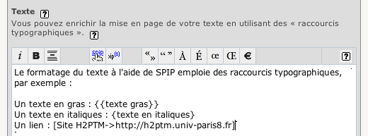 De ces composants, seul du corps de l’article peut être formaté. Pour ce faire, les outils intégrés par défaut dans SPIP sont des « raccourcis typographiques », une technique de masquage de balises HTML (Figure 17), et des éditeurs HTML WYSIWYG basiques (inclus dans les premières versions du système).