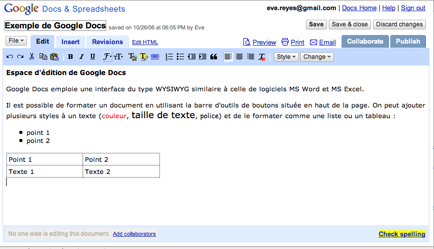 Docs et Spreadsheet permettent à un auteur d’ajouter (inviter) des collaborateurs à participer dans la rédaction d’un document ou tout simplement à le visualiser sur le Web depuis une adresse URL. De plus, l’un des avantages de ces deux outils est l’exportation de documents sous formats PDF, HTML, RDF, OpenOffice et MS Office.