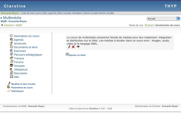 444 Claroline a été utilisé au Département hypermédia, Université Paris VIII, pendant l’année 2005 – 2006 comme support académique du Mastère professionnel THYP (Technologies de l’hypermédia). Bien que la formation ait été dispensée en modalité présentielle, nous avons constaté un usage élevé de Claroline de la part des enseignants pour rendre leurs cours disponibles à tout moment aux étudiants. Ces cours ont été mis dans la plateforme comme des ressources numérisées ou des pièces attachées à un parcours créé par l’enseignant.