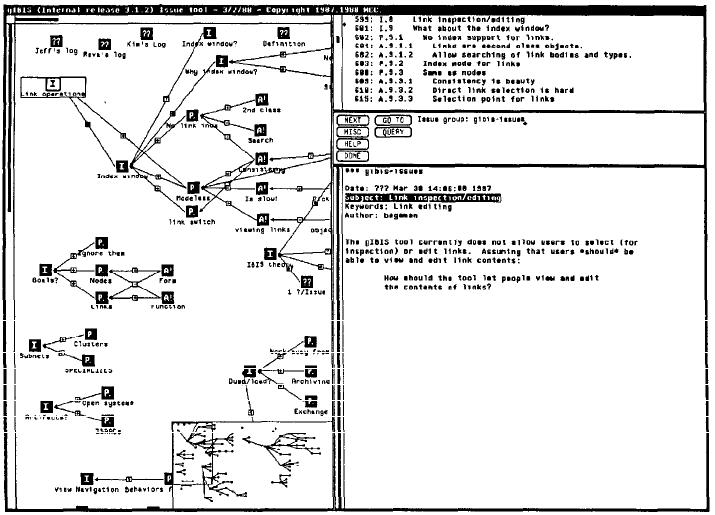 gIBIS est un système qui a été développé par Jeff Conklin et Michael Begeman au sein de la corporation Microelectronics and Computer Technology Corporation (MCC), rattachée à l’université de Texas à Austin, et présenté en 1987 lors de la conférence Hypertext’87 [CON 87].