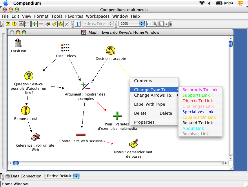 Dans le système, l’utilisateur interagit graphiquement avec ces trois composants (problèmes, postures et arguments), qui représentent des types de nœuds, et crée des relations entre eux à travers huit types de liens, à savoir : généralise, spécialise, remplace, questionne, est suggéré par, répond à, s’oppose à, support.